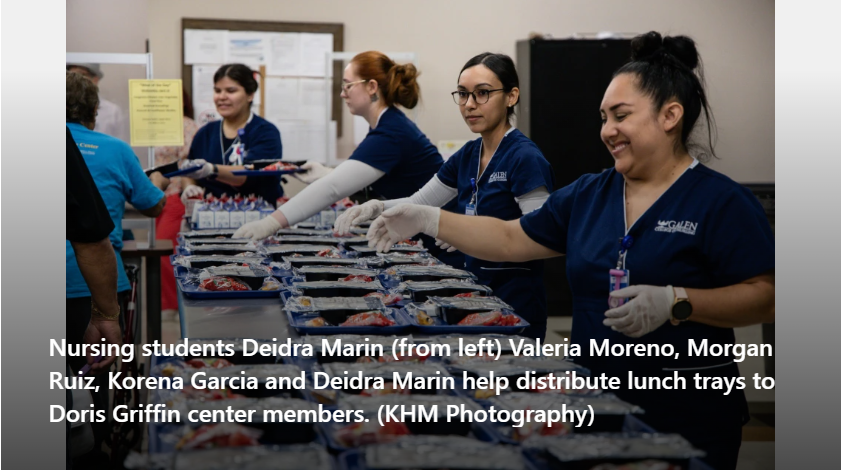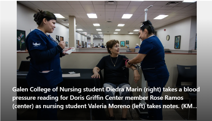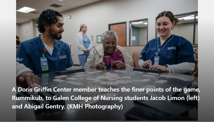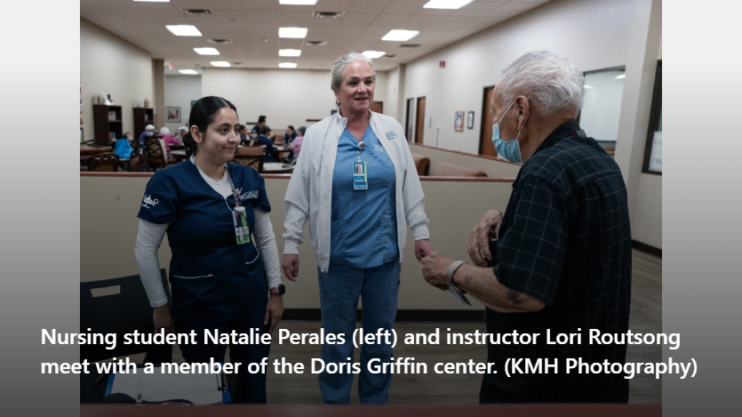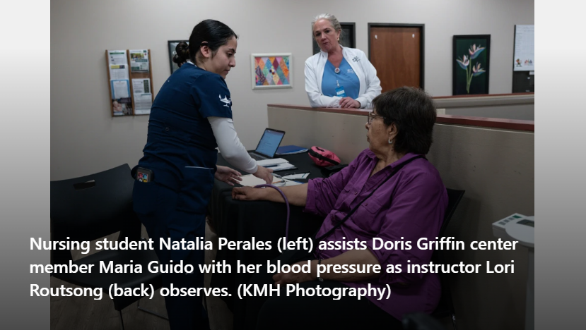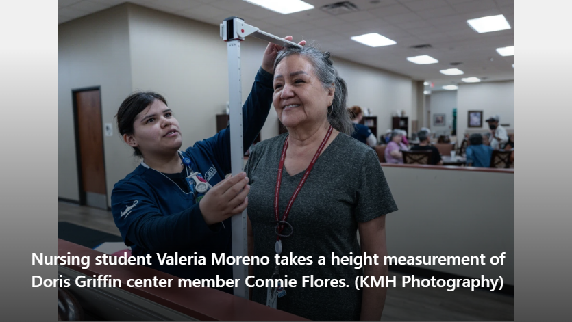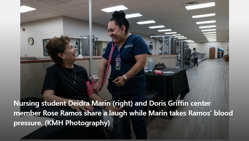 It’s a typical day at the Doris Griffin Senior One Stop Center in San Antonio. Members gather around the pool and ping pong tables, while another group joins a lively Rummikub game. What’s not typical is they are joined by several young people dressed in scrubs.