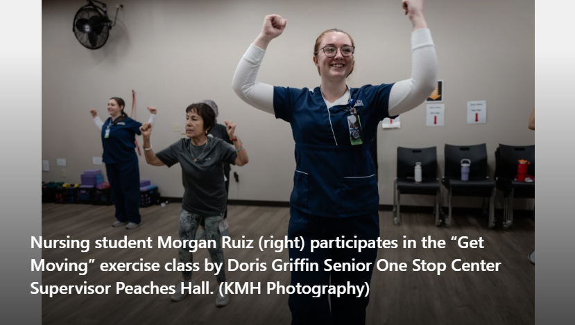 Wednesdays are also the day for “Get Moving,” a fitness course taught by Peaches Hall, WellMed director of the senior center. Among those who took part in this Wednesday’s class was student nurse Morgan Ruiz, who sums up the experience, “I loved it.”